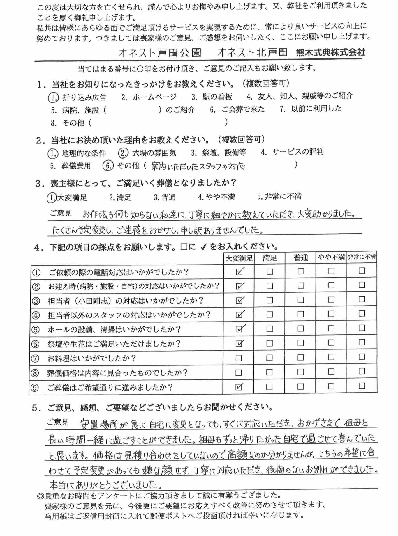 安置場所が急に自宅に変更となっても、すぐに対応いただいておかげさまで祖母と長い時間一緒に過ごすことができました。
