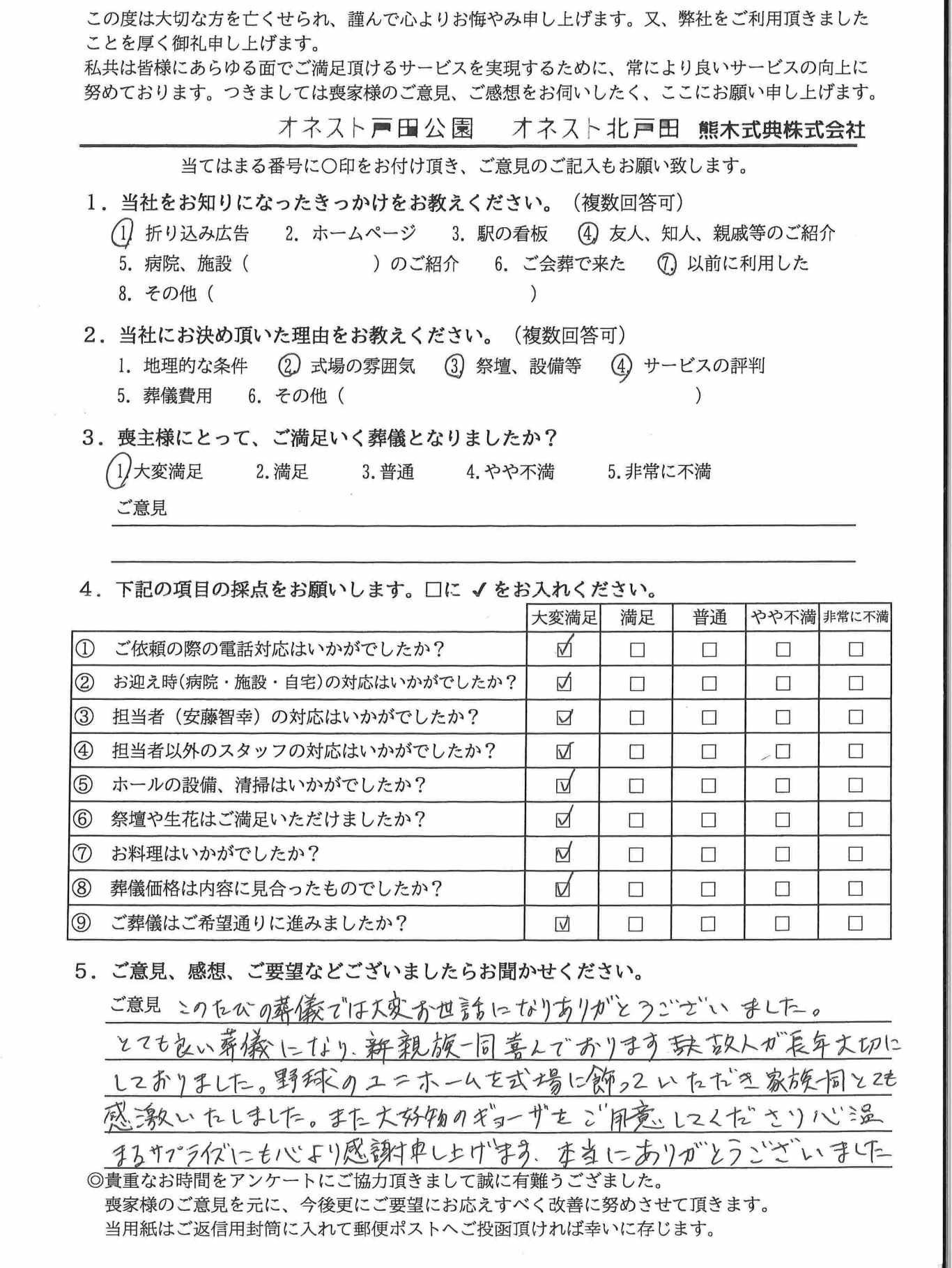 2026年2月10日 / 最終更新日時 : 2026年2月10日 staff-kumaki 心温まるサプライズにも心より感謝申し上げます。 ご意見、感想、ご要望などございましたらお聞かせください。 このたびの葬儀では大変お世話になりありがとうございました。 とても良い葬儀になり、親族一同喜んでおります。 故人が長年大切にしておりました野球のユニホームを式場に飾っていただき家族一同とても感激いたしました。 また、大好物のギョーザをご用意くださり心温まるサプライズにも心より感謝申し上げます。 本当にありがとうございました。